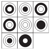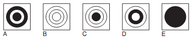 To which hexagon below can a dot be added so that both dots then meet the same conditions as the two dots in the hexagon above?